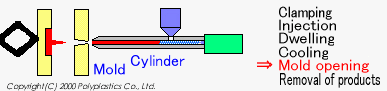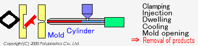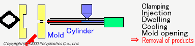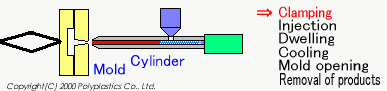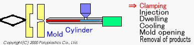 的粒狀或條狀固體塑料加以熔融並賦予高壓,完成射出前備。