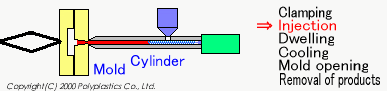 2.熔融塑料的射出:螺桿先倒退然後再前進將熔膠推進射出,此時熔膠自貯