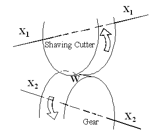 刮齒加工基本上可視之為一對交錯軸齒輪的嚙合,如圖1.1所示分別為刮齒刀與齒輪之嚙合節圓柱。實際的齒輪加工時,刮齒刀與被刮削齒輪裝設於一組歪斜軸上,做嚙合運動並且刮齒刀在被刮齒輪齒面上產生適當的滑移,這是一種交錯軸的嚙合運動,齒面間的接觸為點接觸。