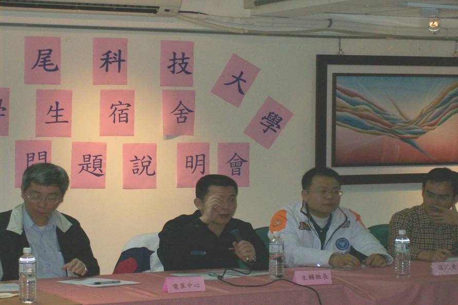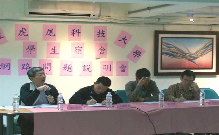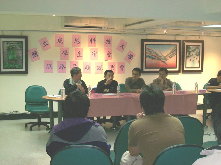 學生宿舍區網路問題說明會96年12月05日(星期三)晚上六時三十分隆重舉辦,有生輔組長楊組長、電算中心張組長及營繕組羅組長共同為住宿同學解決宿舍網路問題,有參與本次說明會之同學均熱烈發言提出宿舍網路之疑問所在,列席長官們都非常仔細一一回答同學在網路上之疑惑,像住宿同學想知道網路繳費及往路穩定性問題均得滿意之答覆,本次活動有得到住宿同學不錯之回應且也達到學生宿區『有問必答、有事立即處理』及『營造建立優質宿舍環境』之目的。(圖/文