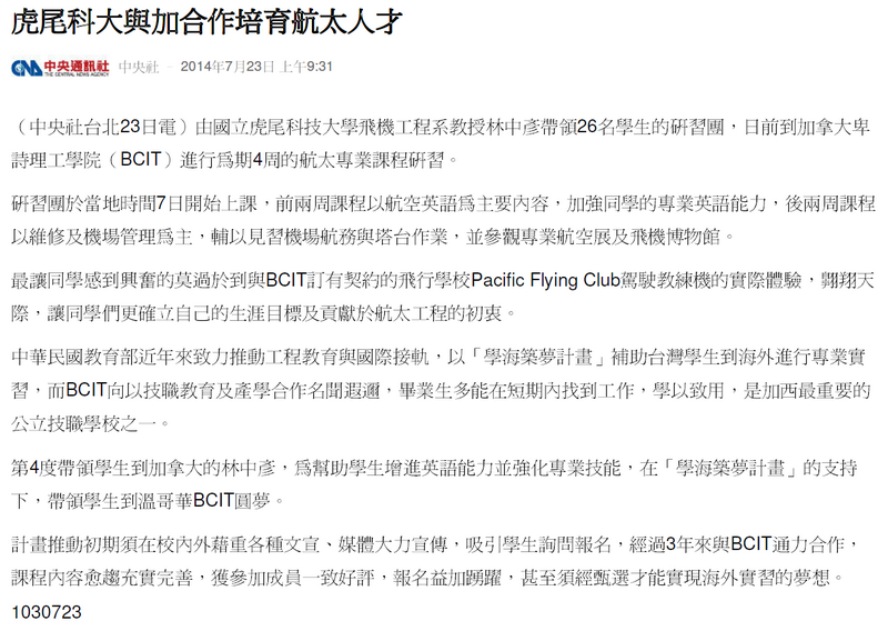 本校與加合作培育航太人才(中央社7月23日報導)