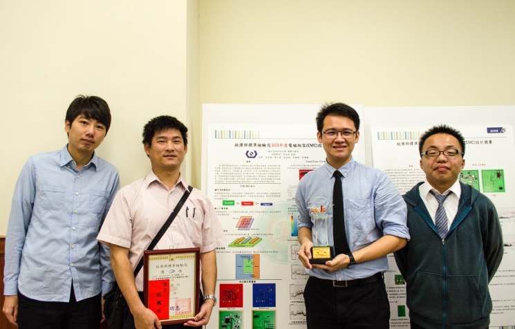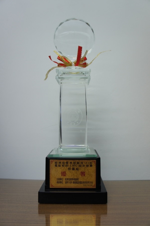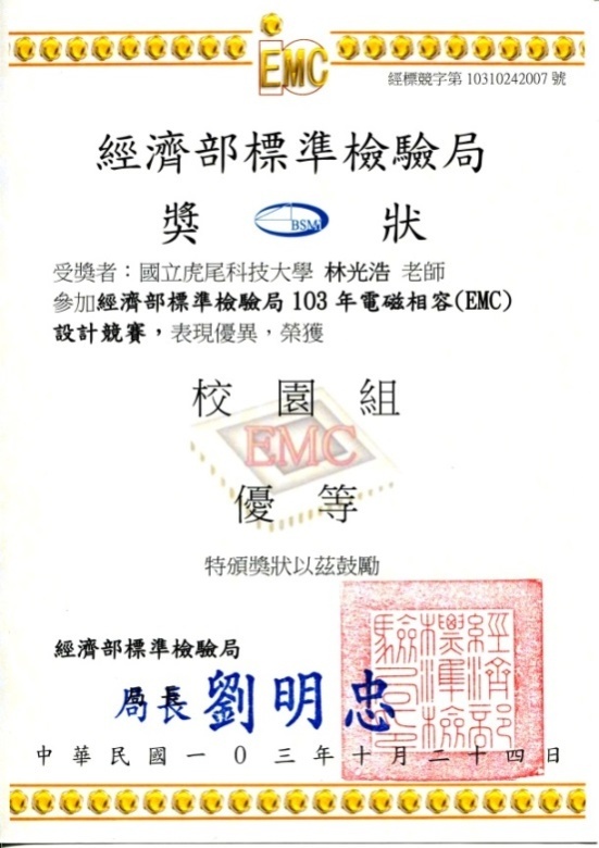 為提昇台灣在EMC領域的整體技術能力,以及配合經濟部標準檢驗局提昇IC-EMC設計與研究技術計畫之執行,經濟部標準檢驗局與逢甲IC-EMC中心共同舉辦第六屆電磁相容(EMC)設計競賽,本校電機工程系林光浩老師帶領沈哲瑩同學參加【經濟部標準檢驗局103年度電磁相容(EMC)設計競賽】榮獲校園組最高榮譽-優等,並獲得獎狀、獎牌及獎金五萬元之獎勵。