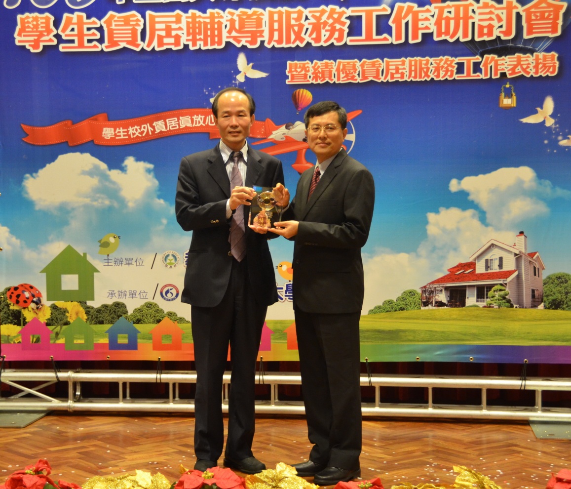 本校榮獲「教育部103年全國大專校院學生賃居輔導服務工作」全國唯一特優組,由軍訓室郭岳麟主任前往正修科技大學領獎,原賃居業務承辦同仁廖玉峯先生同時獲得教育部優秀賃居輔導服務工作主辦人員敘獎。另外本校軍訓室賈維忠先生獲頒「103年度中區友善校園獎 ~優秀學務人員」感謝牌,並於11月14日於雲林科技大學領獎。