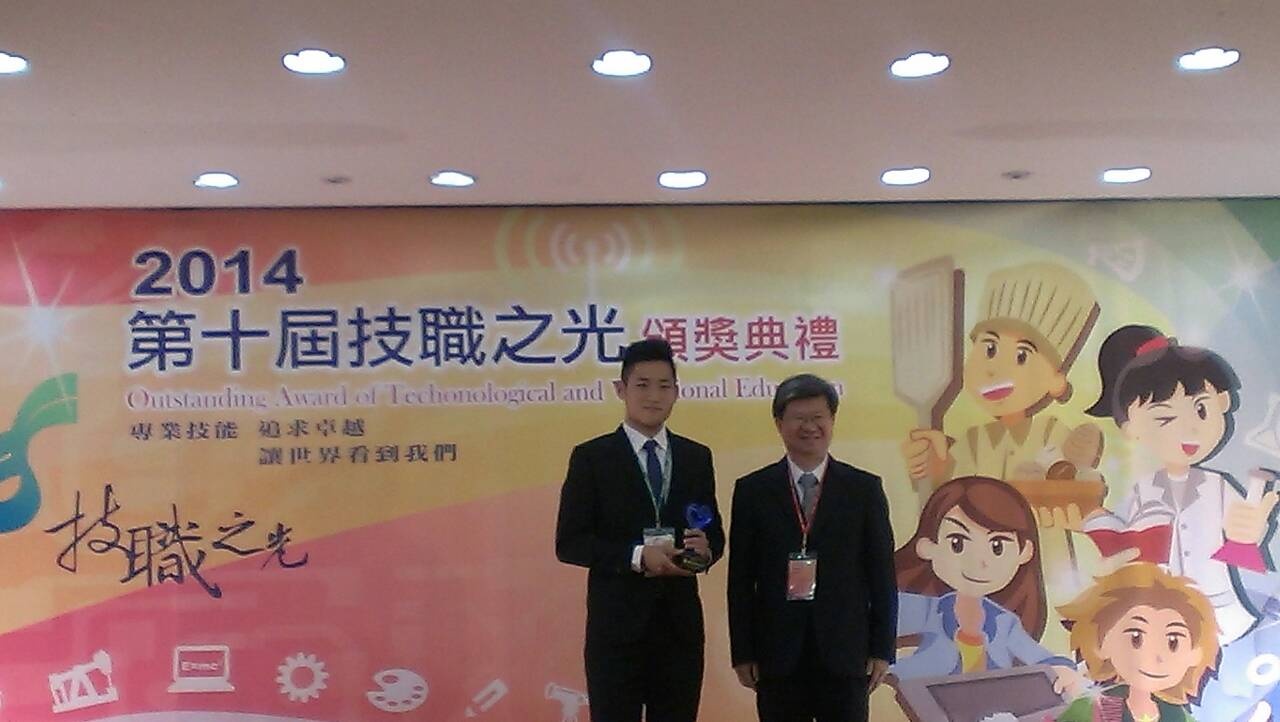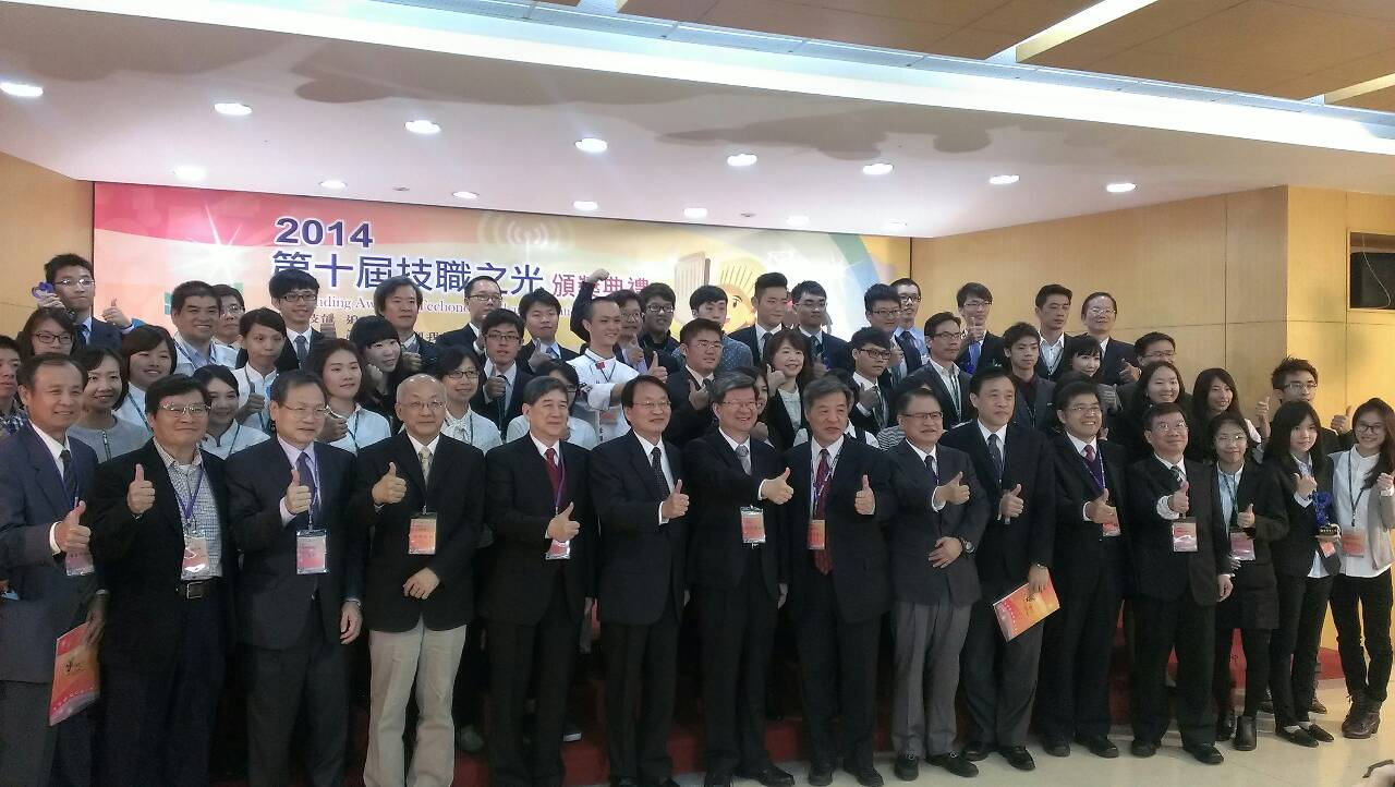 第十屆技職之光頒獎典禮在103年12月02日於台大校友館熱鬧舉行,素有技職教育奧斯卡獎之稱的技職之光獎從登錄在技職風雲榜之中約4100筆的獲獎紀錄與榮譽事蹟中遴選42位同學,在頒獎典禮中由教育部吳思華部長授予此項殊榮。本校動力機械工程系張東琳同學,在綜合表現及其他傑出事蹟中獲頒這項殊榮,研發長與班導師也親臨會場分享這份喜悅。