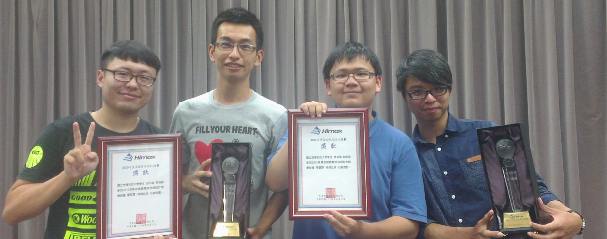 國立虎尾科技大學電機系 林益申、賴聖翔、邱心鴻與李柏毅四位同學參加「2015奇景盃IC佈局設計競賽」締造佳績,從公私立大專校院150隊好手中脫穎而出,獲得特優、優等與最佳指導教授獎。