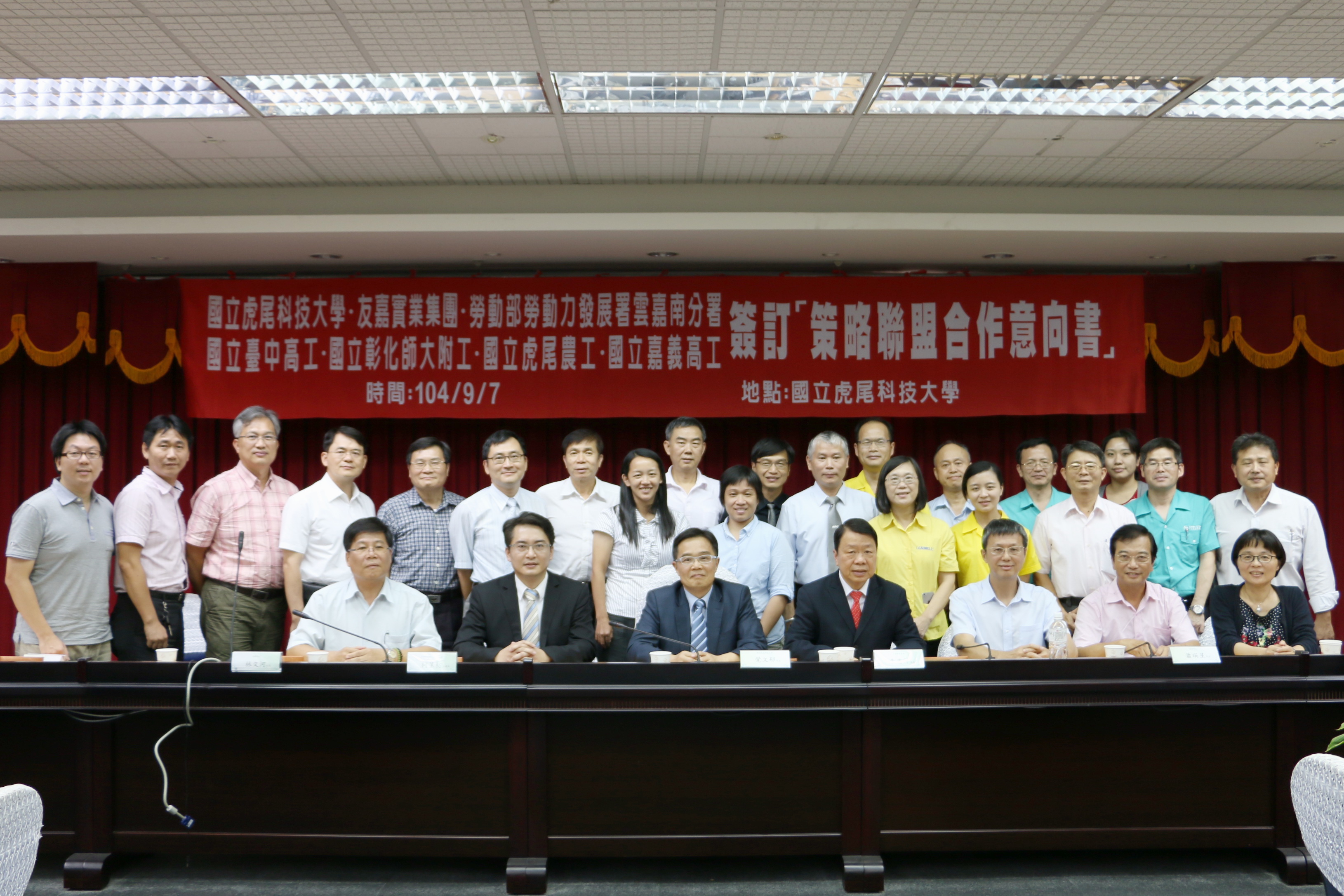 為落實向下扎根、學用合一與對焦企業的目標。本校與友嘉實業集團、勞動部勞動力發展署雲嘉南分署、彰師附工、臺中高工、虎尾農工、嘉義高工共同成立人才培育的平台,謹訂於104年9月7日共同簽訂「策略聯盟合作意向書」。