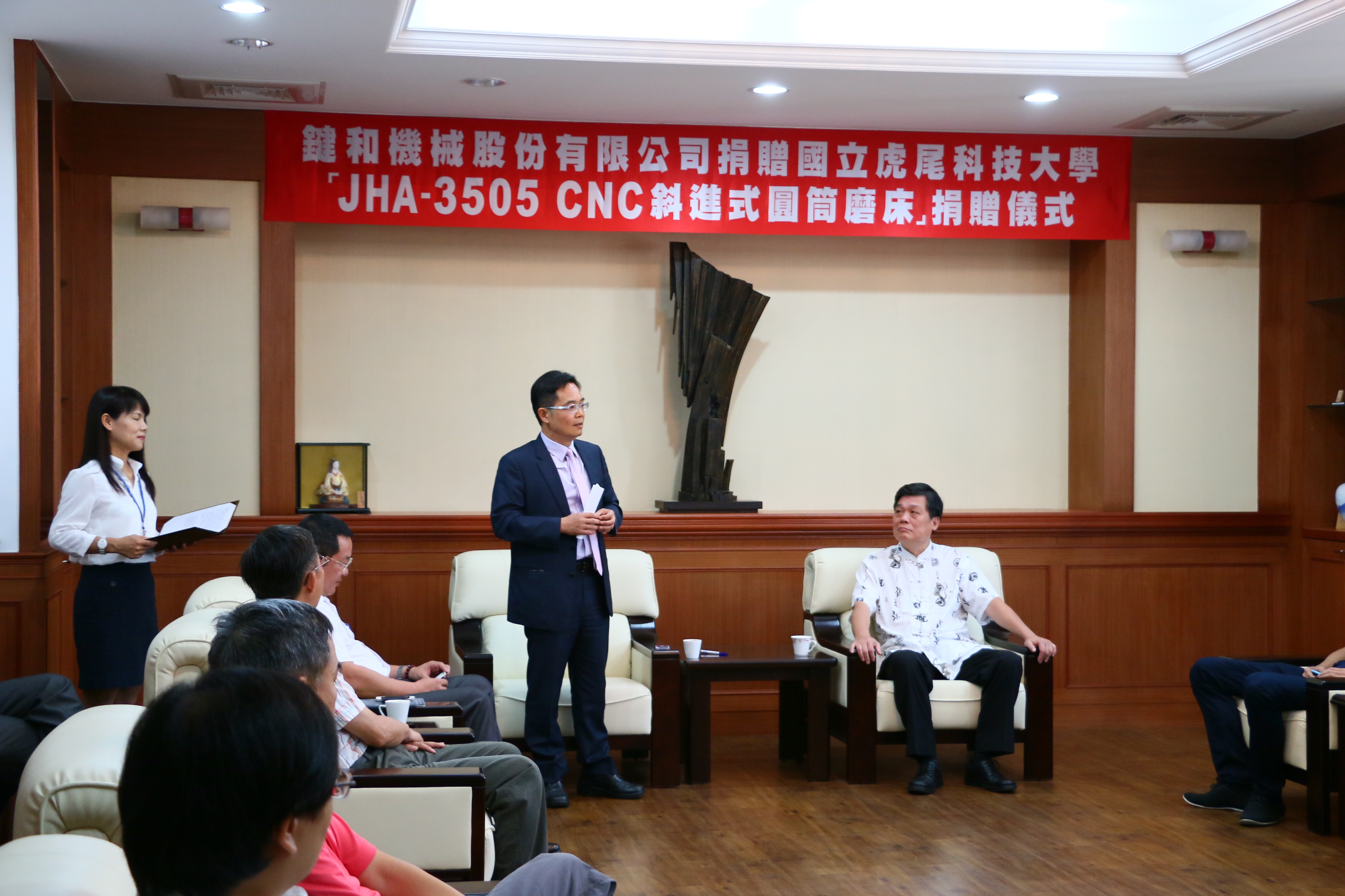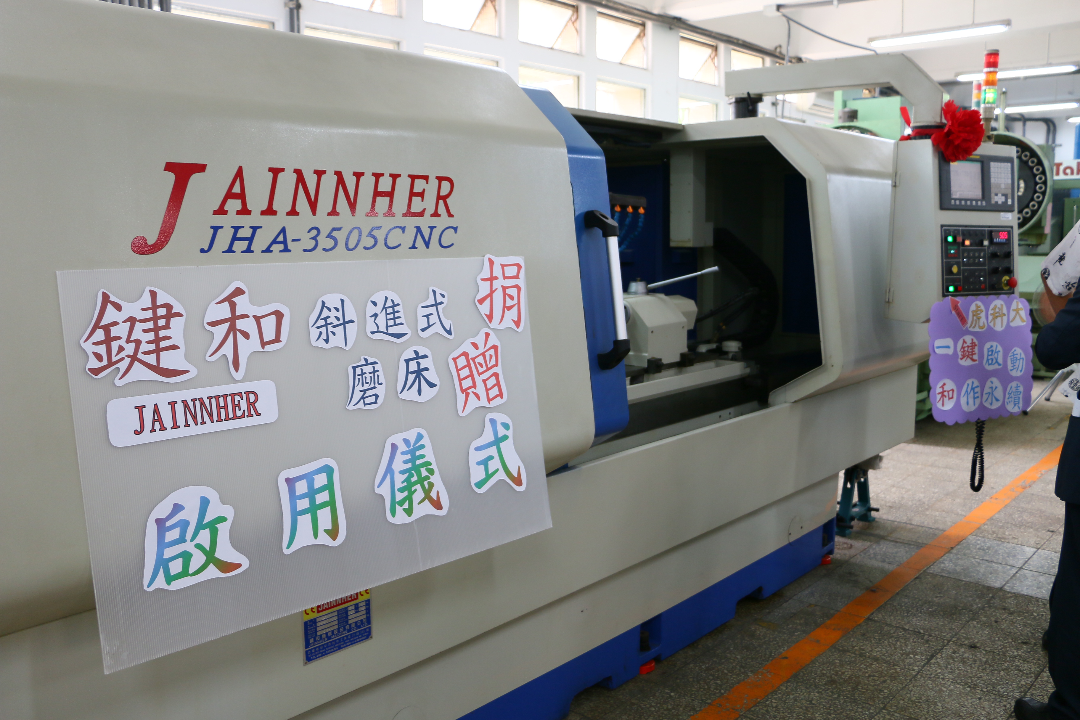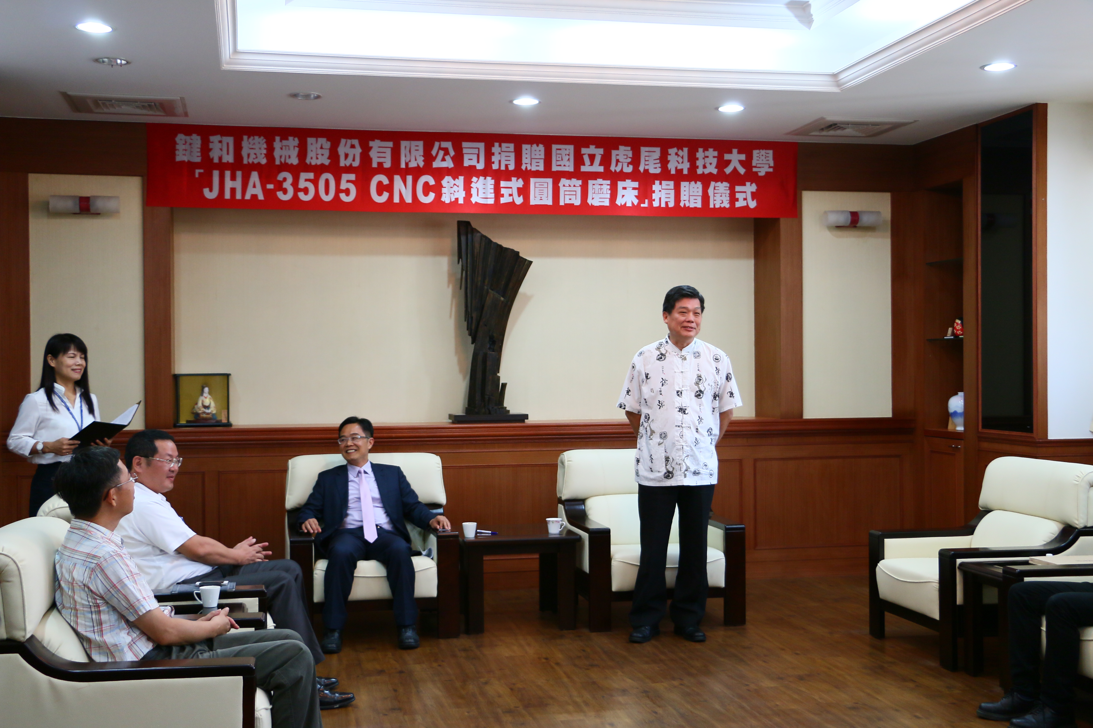 鍵和機械股份有限公司(Jainnher Machine Co., LTD)於2015年9月8日在國立虎尾科技大學行政大樓2樓會議室,舉行CNC斜進式圓筒磨床之設備捐贈儀式,由鍵和機械公司陳朝旭董事長與虎尾科大校長覺文郁博士共同主持並簽署,並由覺校長代表致贈感謝狀與紀念品。