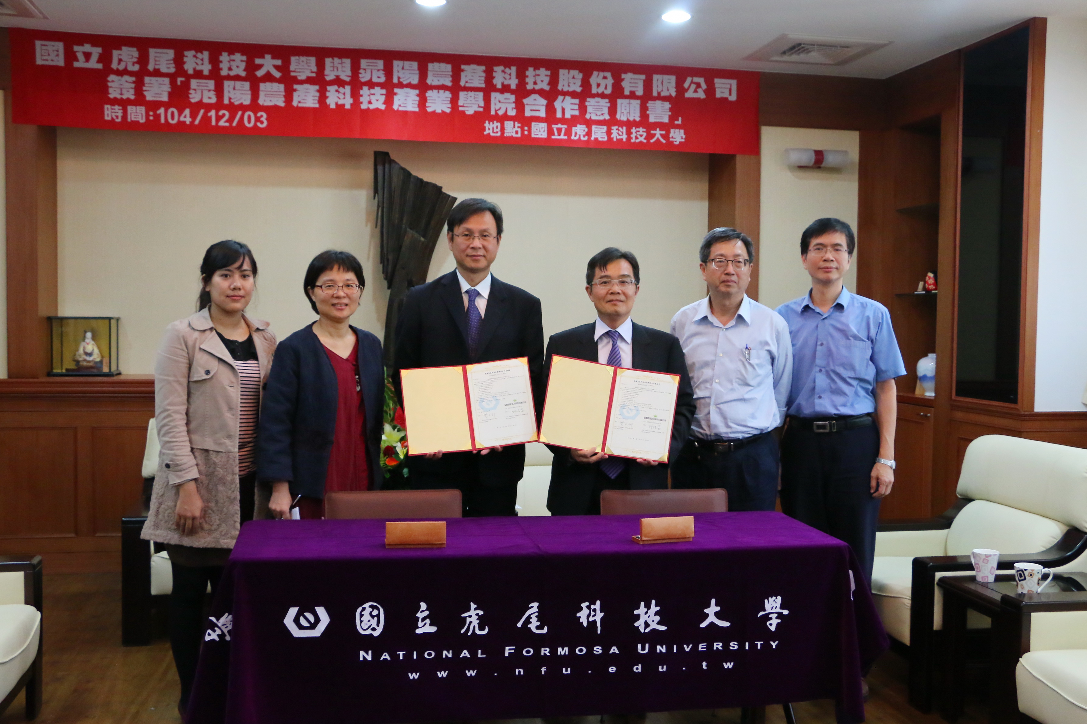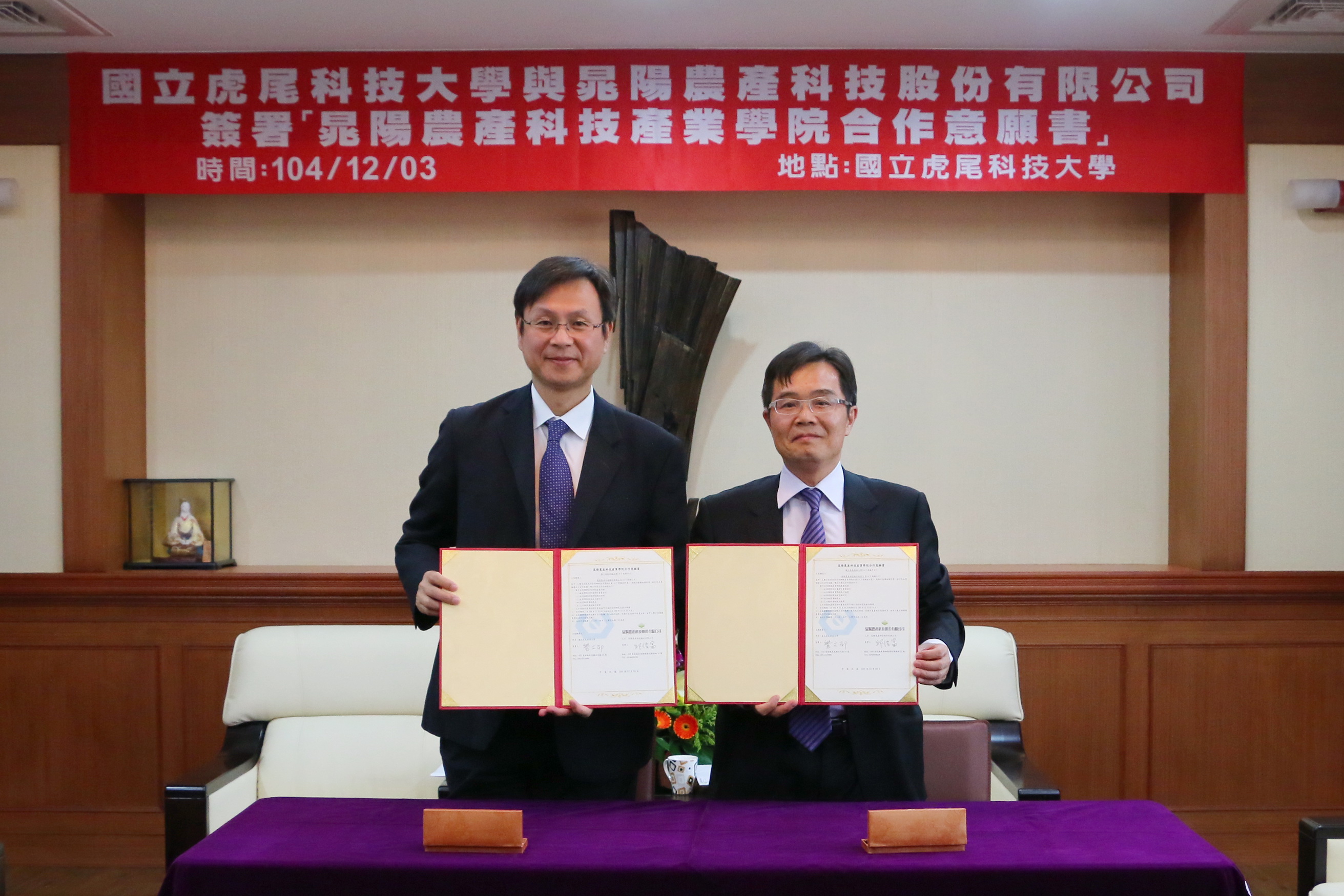 本校與晁陽農產科技股份有限公司於104年12月3日簽訂合作意願書,共同合作規畫成立「晁陽農產科技產業學院」,由校長覺文郁博士與晁陽農產科技邱信富董事長共同主持簽約典禮。晁陽農產科技提供產業學院基金用於人才培育相關領域。