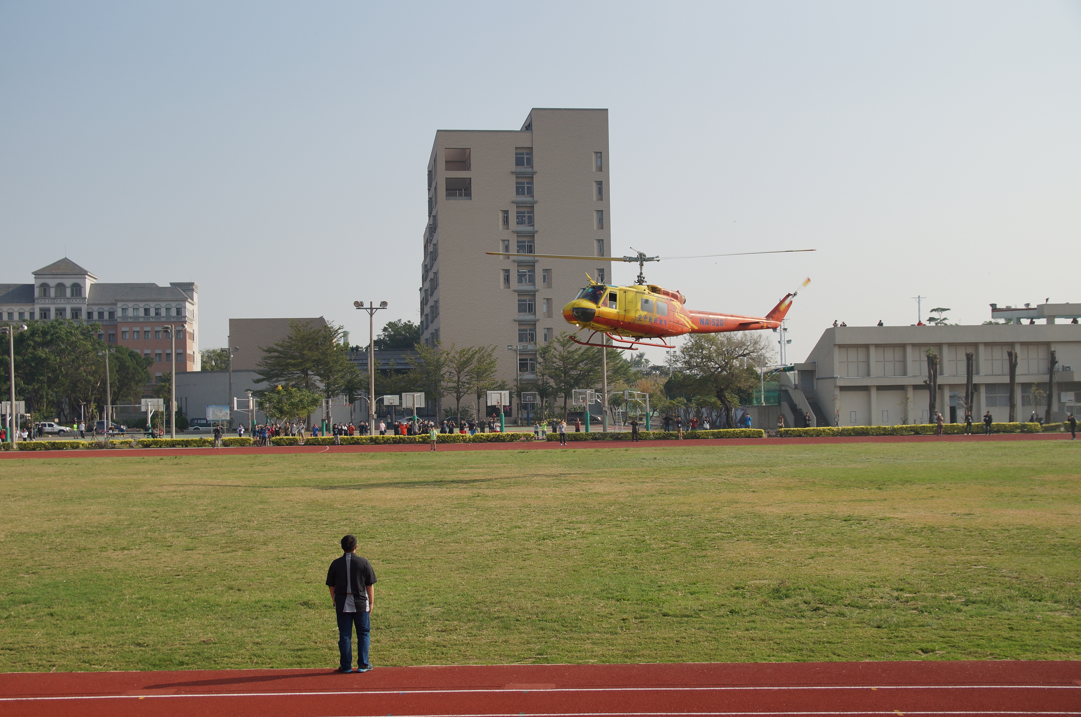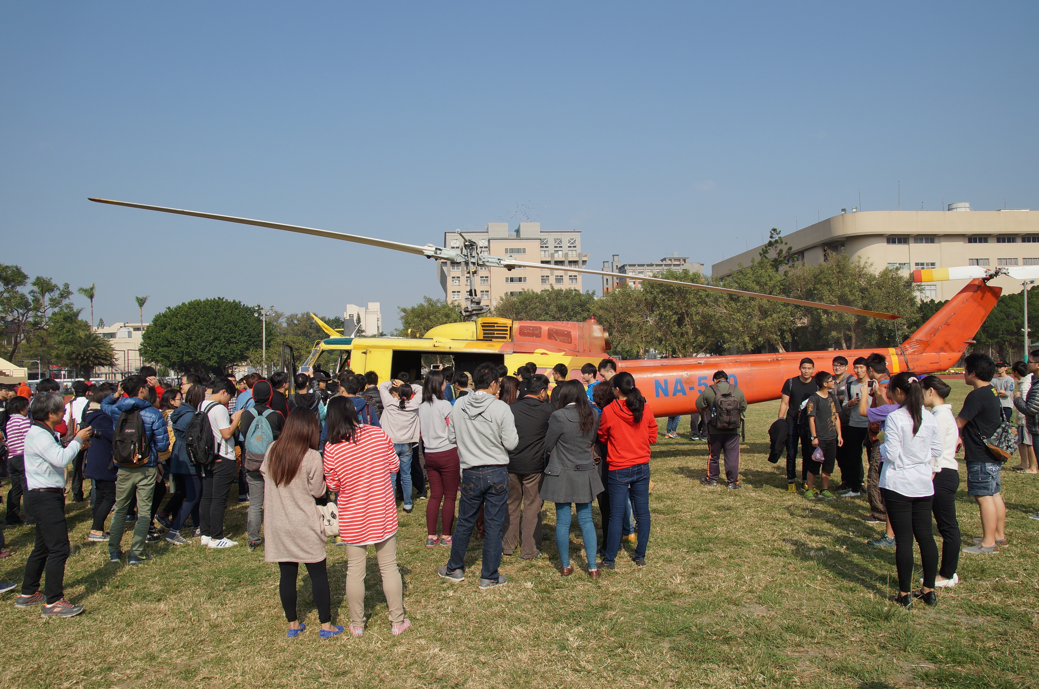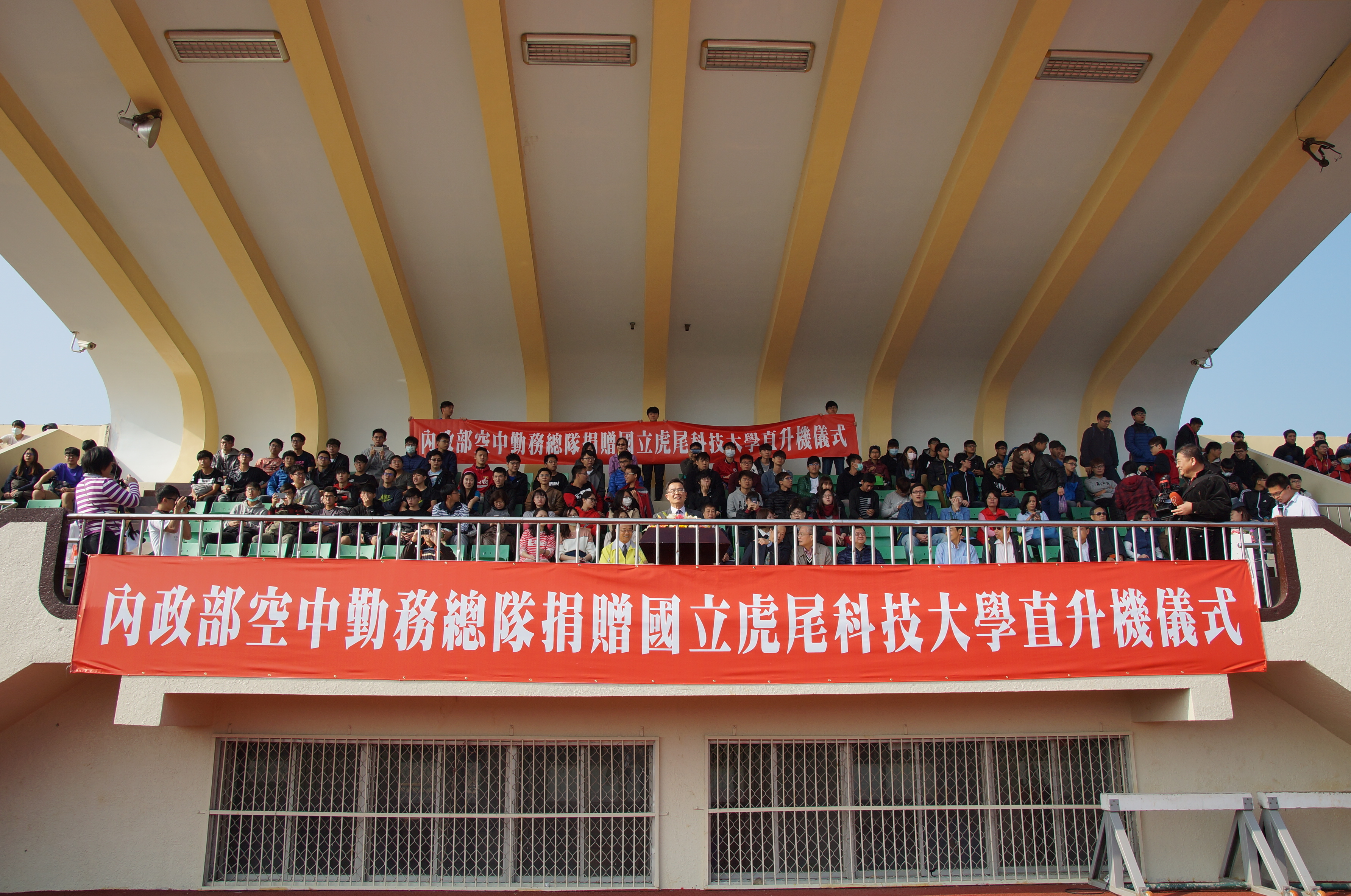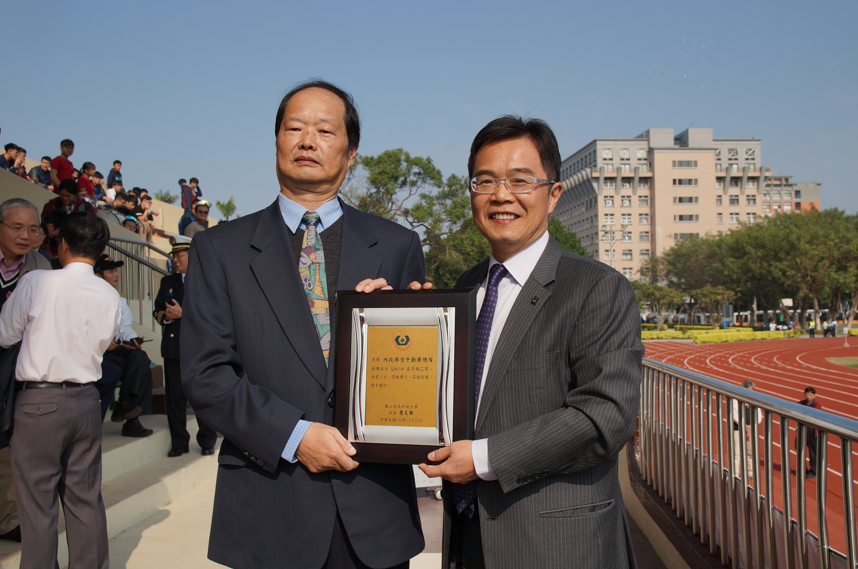 內政部空中勤務總隊於104年12月29日十點在國立虎尾科技大學田徑場舉行「UH-1H」直升機捐贈儀式,由空中勤務總隊王啟通副總隊長與國立虎尾科大校長覺文郁博士共同主持,並由覺校長代表致贈感謝狀。本件捐贈案將結合虎尾科大師生團隊研發實力和航空業界的實務技術經驗與設備,開創產學合作雙贏局面,培育出航空產業界第一線的優秀人才,與產業脈動同步接軌。