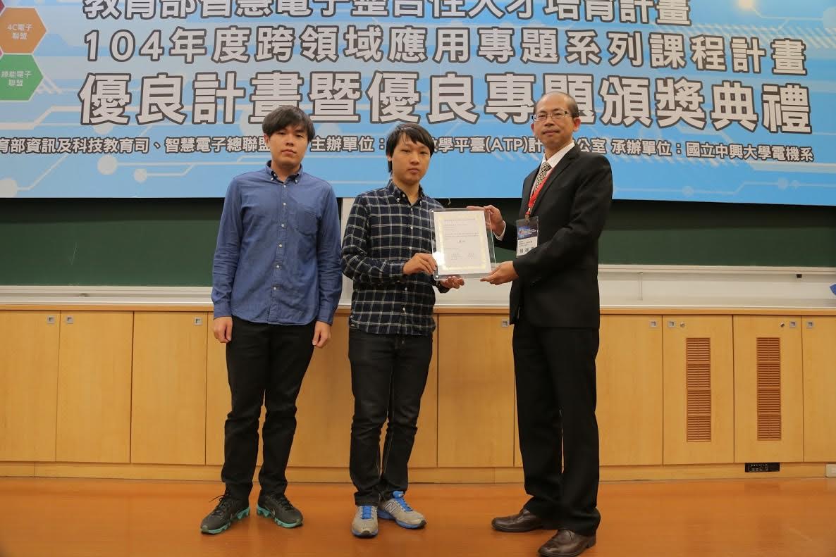 教育部智慧電子整合性人才培育計畫暨優秀作品頒獎典禮,於104年12月12日在國立臺灣大學博雅教學館盛大舉行,本校資訊工程系陳國益助理教授帶領學生盧柏安、陳俊廷,以作品「互動式英文學習系統」作品參加比賽,並於百餘組參賽作品中脫穎而出,榮獲智慧電子應用設計佳作獎項。