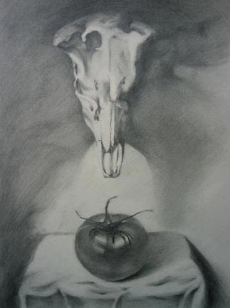 【牛骨與番茄】。(Bull Bones and Tomato) 我想表現永恆與短暫,短暫流逝的俗豔向永恆的美致敬,採用十字形構圖表現宗教感覺。