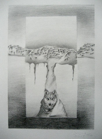 畫面左右二方是人工幾何建築,中間的原野也因開發而瘦骨嶙峋,野狼也只能在地底洞穴(墓穴)看這場正在進行的業緣。
