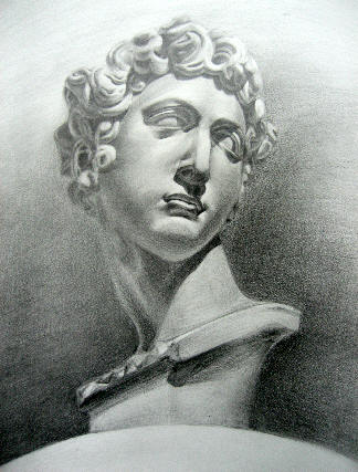 【盧舍那佛雕像】(A Statue of Vairocana)奉先寺是中國河南省龍門石窟規模最大的露天佛龕,長寬各30餘米,也是唐代雕塑藝術的傑出代表。據造像銘記載,此窟開鑿於唐代武則天時期,歷時三年,主佛盧舍那佛高達17.14公尺,據佛經說,盧舍那意即光明遍照。這尊佛像面容豐腴,雍容大度,兩耳下垂,形態圓滿,具有高度的藝術感染力。這幅素描作品我想表現佛莊嚴圓滿的氣勢,利用由上下的光線表現光明遍照的無量慈悲感覺。(註:毘盧舍那為法身佛之名,盧舍那為報身佛之名)