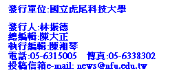 任何形式之轉載,請先與國立虎尾科技大學秘書室聯繫。 |