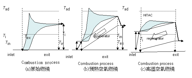 圖6為原始燃燒、預熱空氣燃燒(PAC)與高溫空氣燃燒(HiTAC)的溫度與燃燒過程示意圖。