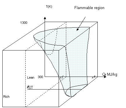 MJ/kg),其於常溫下並無法順利地引燃,所以當提高初始溫度至1300K時,由圖中可以清楚地發現其擁有接近高熱值燃料的可燃極限,所以這樣的燃燒技術可以適用於極貧油或低熱值燃料的燃燒。此種方式稱為預熱空氣燃燒(Preheat