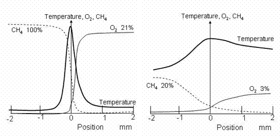 reaction zone)稱為薄碎焰(flamelet)。在這個區域內有著快速的反應使得溫度、濃度產生了極大的梯度(gradient),主要均是因為反應區內有著大量的熱釋放。相反地,以一氮氣稀釋的甲烷氣(40%)及氮氣稀釋的空氣(氧氣濃度約8%),圖8中可以看出火焰反應區變厚,火焰溫度較低、預熱溫度均高於1273K,此低火焰溫度主要是因為預熱反應物及大量稀釋氮氣的空氣,因為在大量稀釋反應氣體,使得反應區的局部反應率變小,需增加反應區體積,來維持相同的原始燃燒反應率。因此,燃燒所產生反應及熱釋放,夾帶著大量的生成物氣體,使得與原始燃燒相比,其分佈範圍較廣。因此,有著較緩和的溫度上升,這些機制會抑制燃燒系統中的NOx產生。